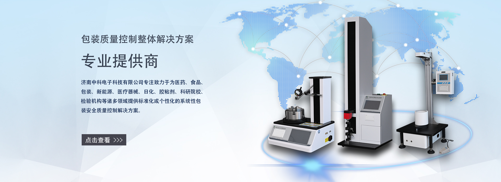 濟(jì)南中科電子科技有限公司是一家集包裝及膜材檢測(cè)儀器的研發(fā)、制造、銷(xiāo)售和服務(wù)為一體的專(zhuān)業(yè)科技公司。專(zhuān)注致力于為食品、醫(yī)藥、包裝、新能源、醫(yī)療器械、石化、日化、膠粘劑、科研院校、檢驗(yàn)機(jī)構(gòu)等諸多領(lǐng)域提供標(biāo)準(zhǔn)化或個(gè)性化的系統(tǒng)性包裝及膜材質(zhì)量控制解決方案。